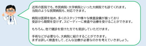 検査だけでなく、日常の「かかりつけ」医療機関として、生活習慣病の予防・治療なども行っておりますので、近所のクリニックに受診するのと同じ感覚で、お気軽にご利用ください。